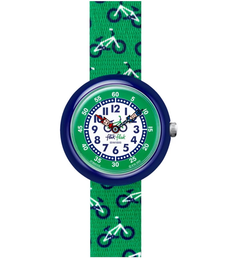 Popatrz na BIKYWAY! Stylowy, zielono-niebieski zegarek dla dzieci ucieszy miłośników dwóch kółek. Edukacyjny prezent do nauki godzin!