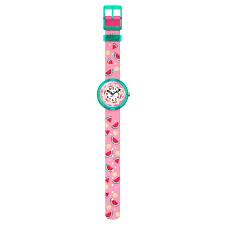 Zielona przezroczysta koperta z polimeru i tarcza z cyfrowym nadrukiem sprawiają, że ten szwajcarski zegarek to prawdziwy hit wśród dzieci. Materiałowy pasek, który można prać w temperaturze 40°C ozdabiają nadrukowane arbuzy i cytryny, dodając właścicielowi wyjątkowej świeżości.